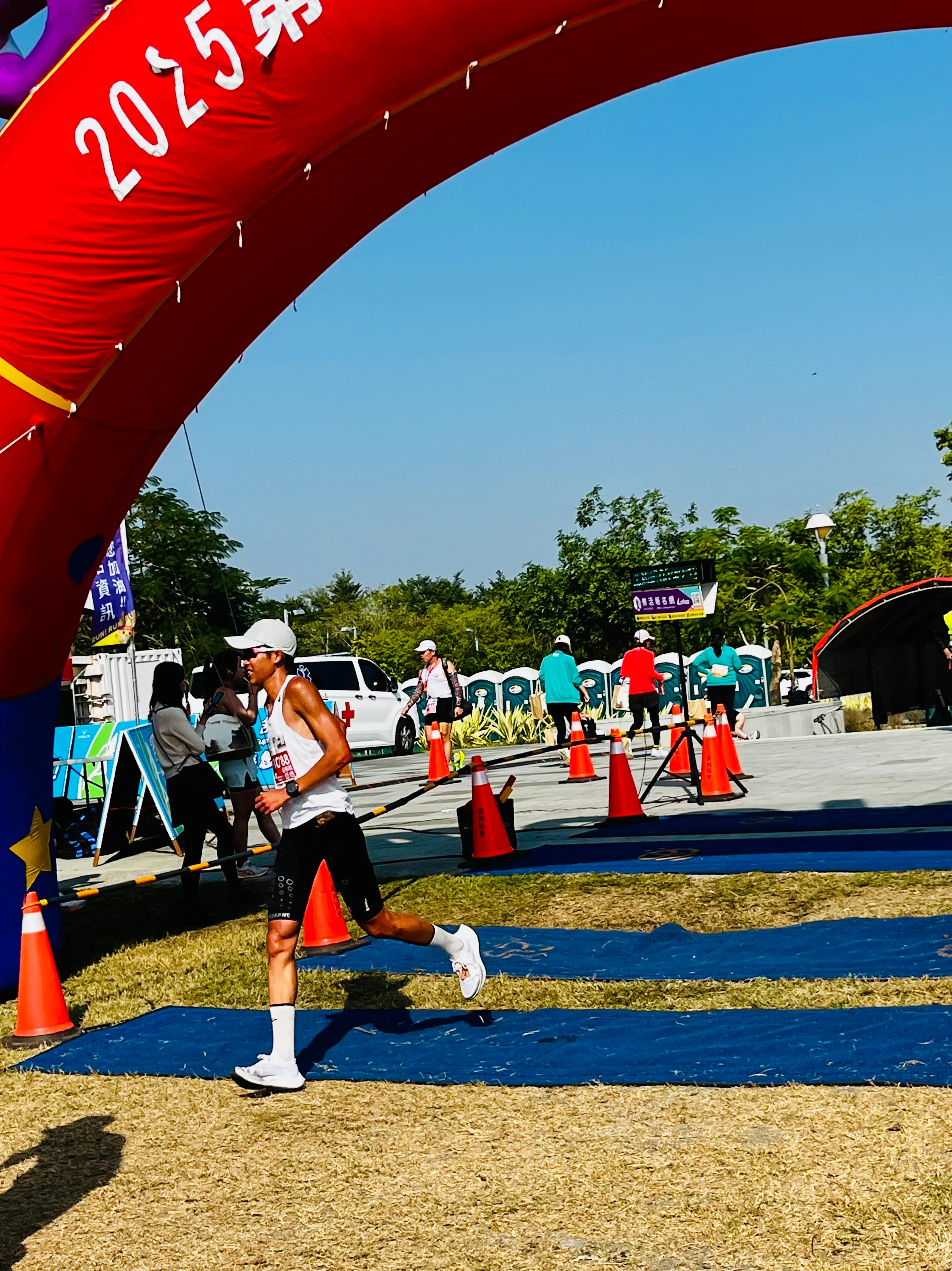 抵達號稱「全臺最美馬拉松會場」後,迅速完成寄物,在停車場做 馬克操 熱身,當然也沒忘了賽前最重要的儀式 — 排隊上廁所。