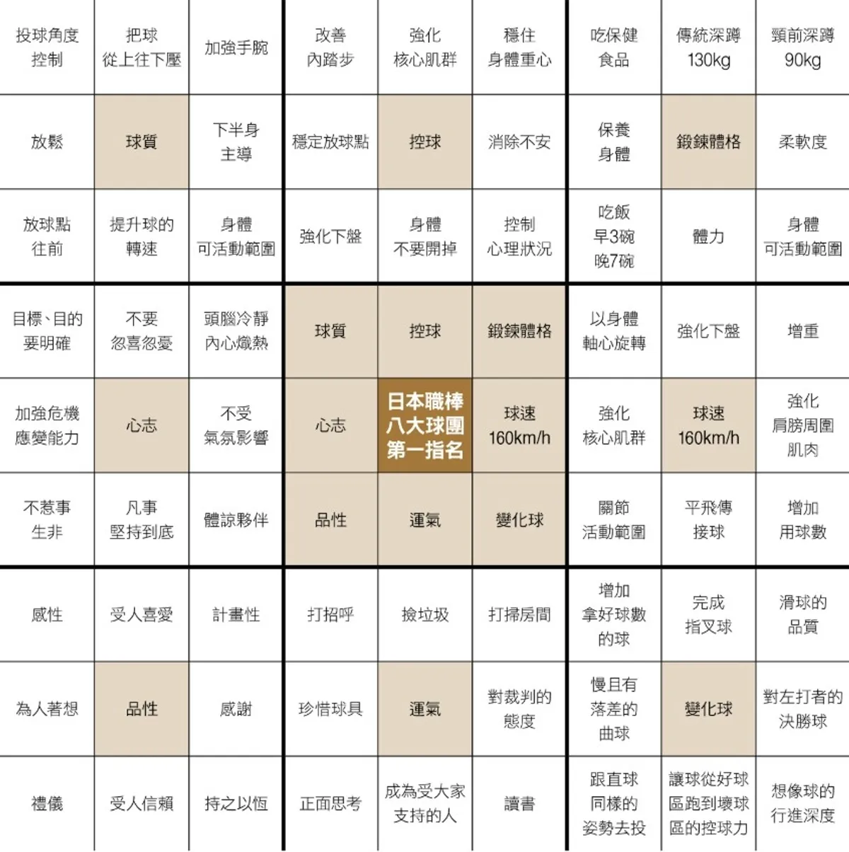 透過這套環環相扣的系統,大谷將抽象的願景,視覺化成每日行動計劃,確保每天的訓練都有清晰的方向,藉此不斷精進自己。