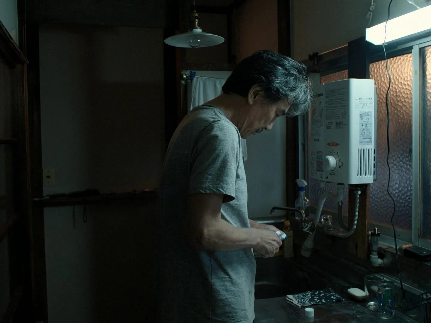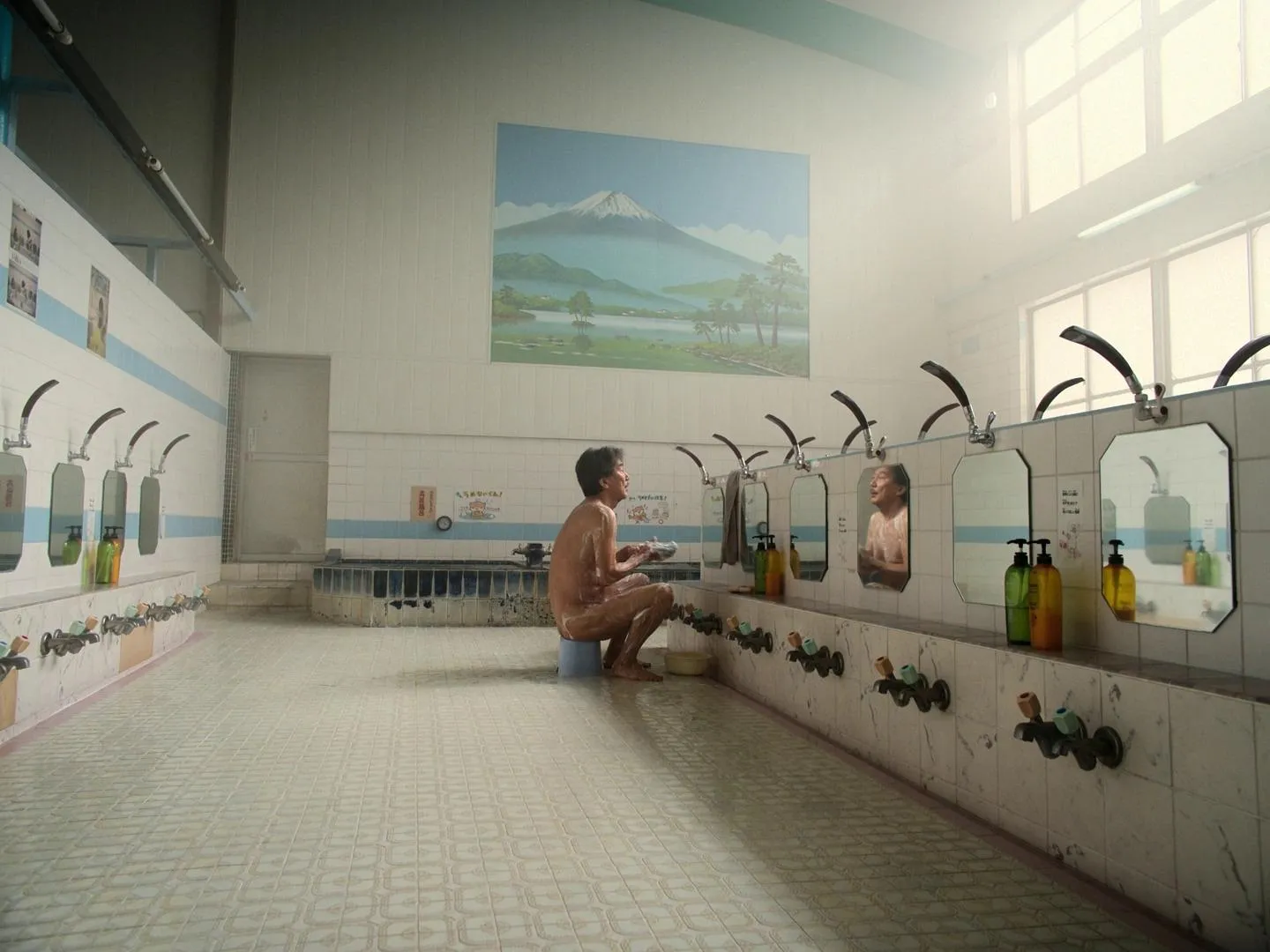 結束白天一絲不苟的勞動工作,他騎上腳踏車,穿過 跨河大橋 前往大眾澡堂,洗去一身的汗水與疲憊。