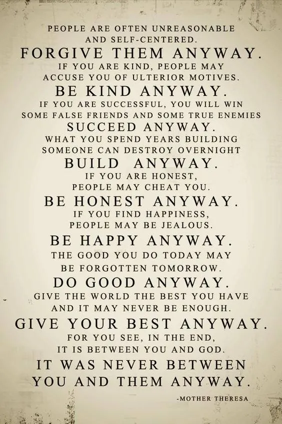 If you are kind, people may accuse you of selfish ulterior motives. Be kind anyway.