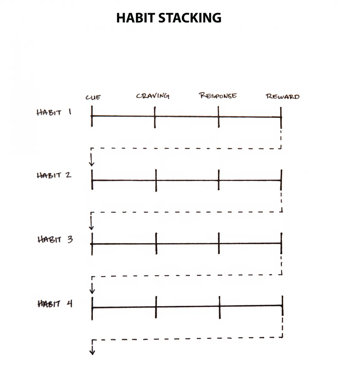 Habit stacking increases the likelihood that you’ll stick with a habit by stacking your new behavior on top of an old one. This process can be repeated to chain numerous habits together, each one acting as the cue for the next.